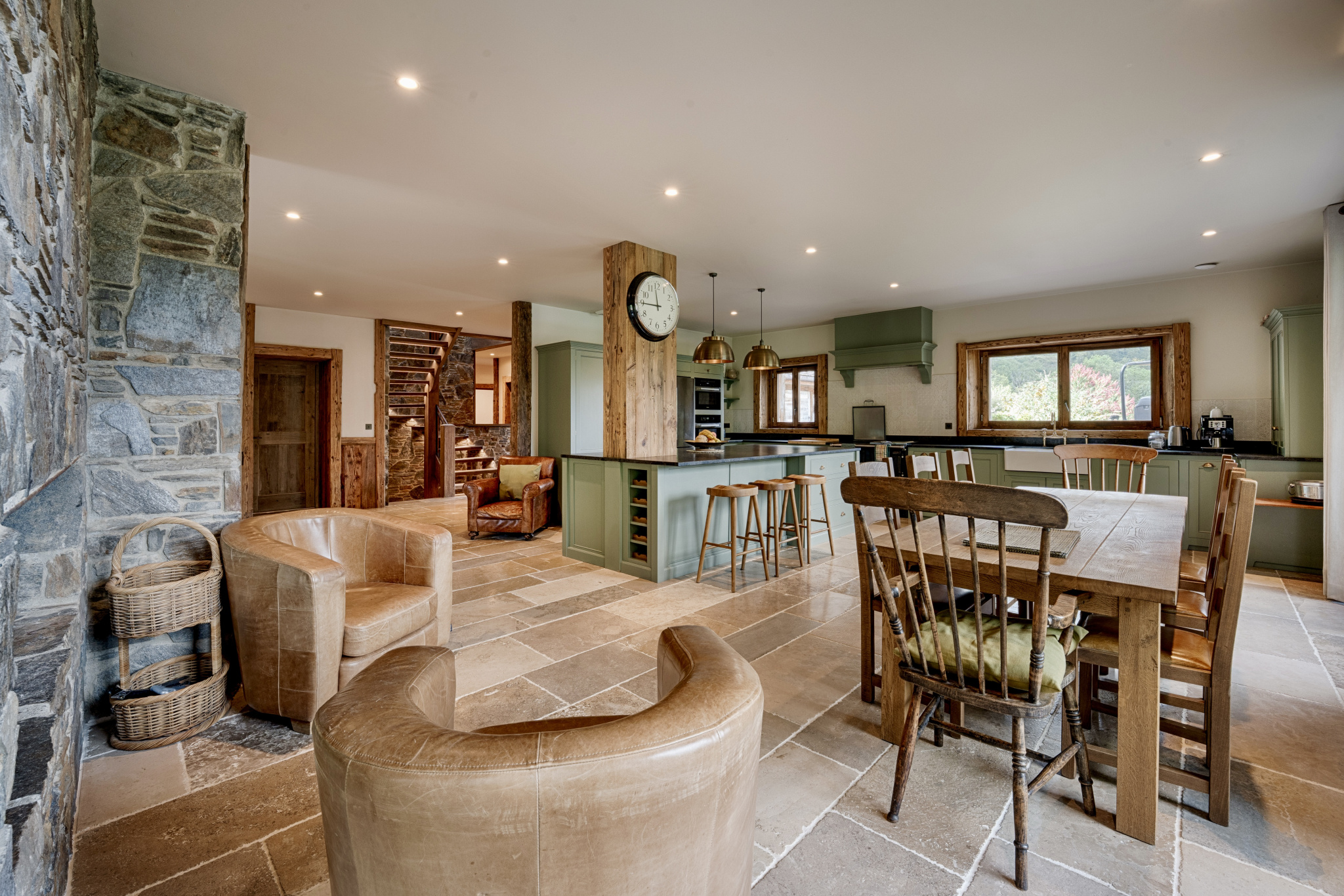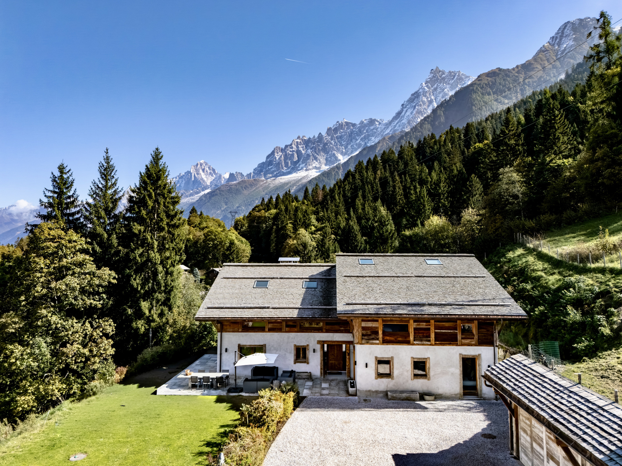 GRIAZ FARM - LES HOUCHES. Completely reconstructed in 2020, this imposing 476 m2 farm that dates from the 18th Century has been thoughtfully designed to provide a stunning 5 bedroom luxurious alpine retreat whilst retaining the essence of an historic property. Sitting high above the valley floor on an extremely secluded plot of 19,200 m2 the farm is laid out as follows: on the ground floor - entrance hall, 2 en-suite bedrooms, laundry room, office, utility room, guest WC and vast kitchen / dining area with double height living room separated by a fireplace. The first floor contains the master bedroom complete with dressing room and bathroom, 2 further en-suite bedrooms and a second 78 m2 double height living room with fireplace. The lower ground level consists of a gym, storage room, a technical room that houses the efficient wood pellet heating system and a 42 m2 space that could easily be transformed into a home cinema or bunk room. A four car garage with plenty of storage completes this wonderful home.
