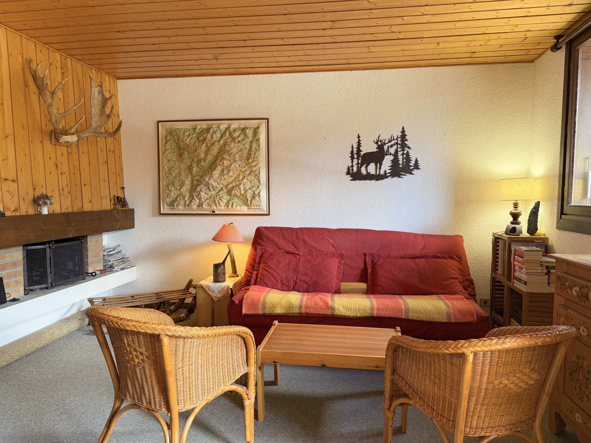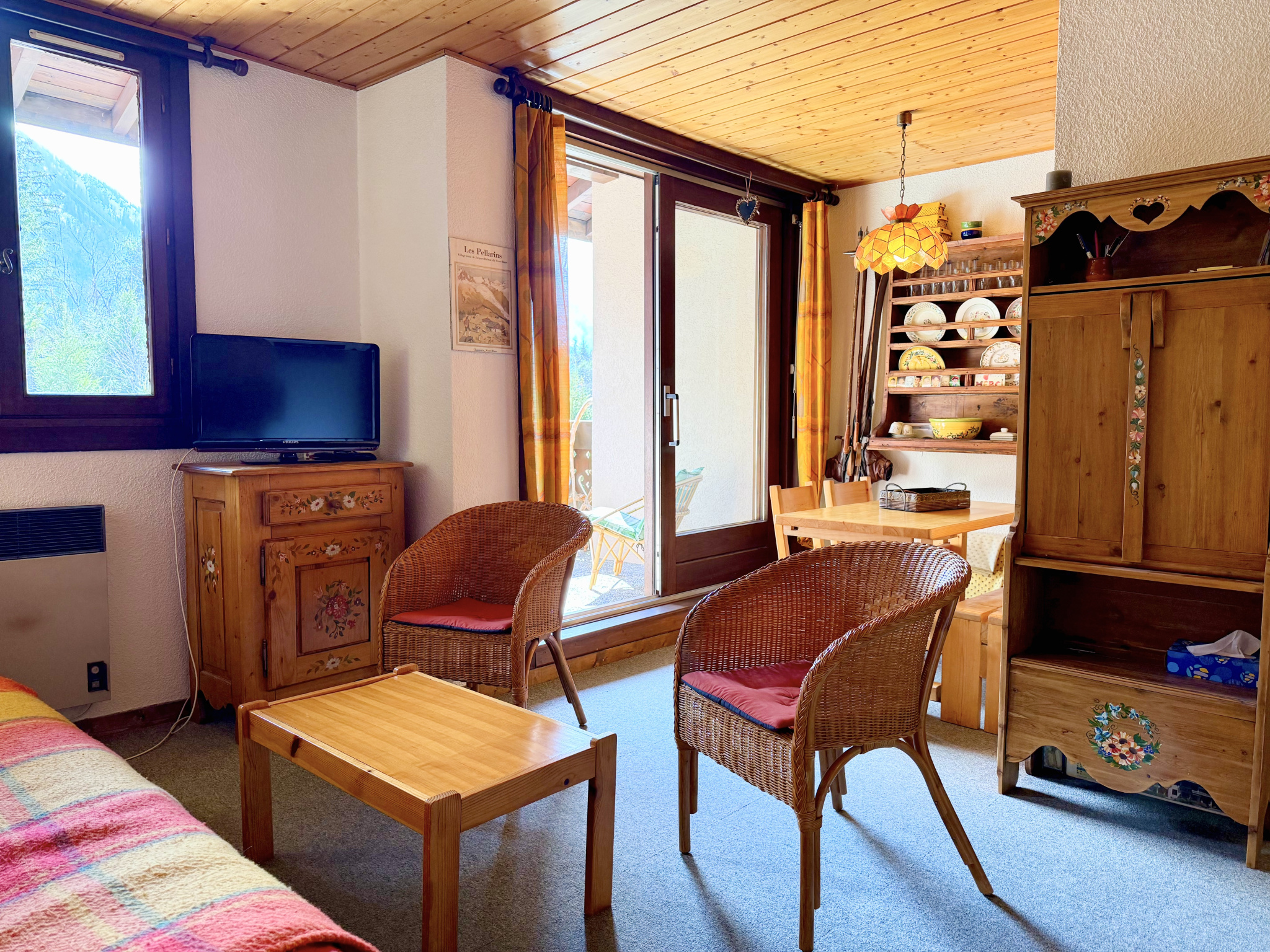 APPARTEMENT T2 MARGUERITE, CHAMONIX LES PRAZ - Situé dans lle secteur ensoleillé de la plaine des Praz, cet appartement d'une superficie Loi carrez de 35,10 m2 s'organise autours d'un salon séjour avec cheminée à foyer ouvert, une kitchenette équippée semi ouverte, une beau balcon exposé sud-est bénéficiant d'une vue incroyable sur toute la chaine du Mont-Blanc; une chambre avec rangements, une salle de bain avec WC complètent le bien. Une cave et un parking souterrain privatifs, ainsi qu'un parking extérieur et un jardin de copropriété complètent le bien.