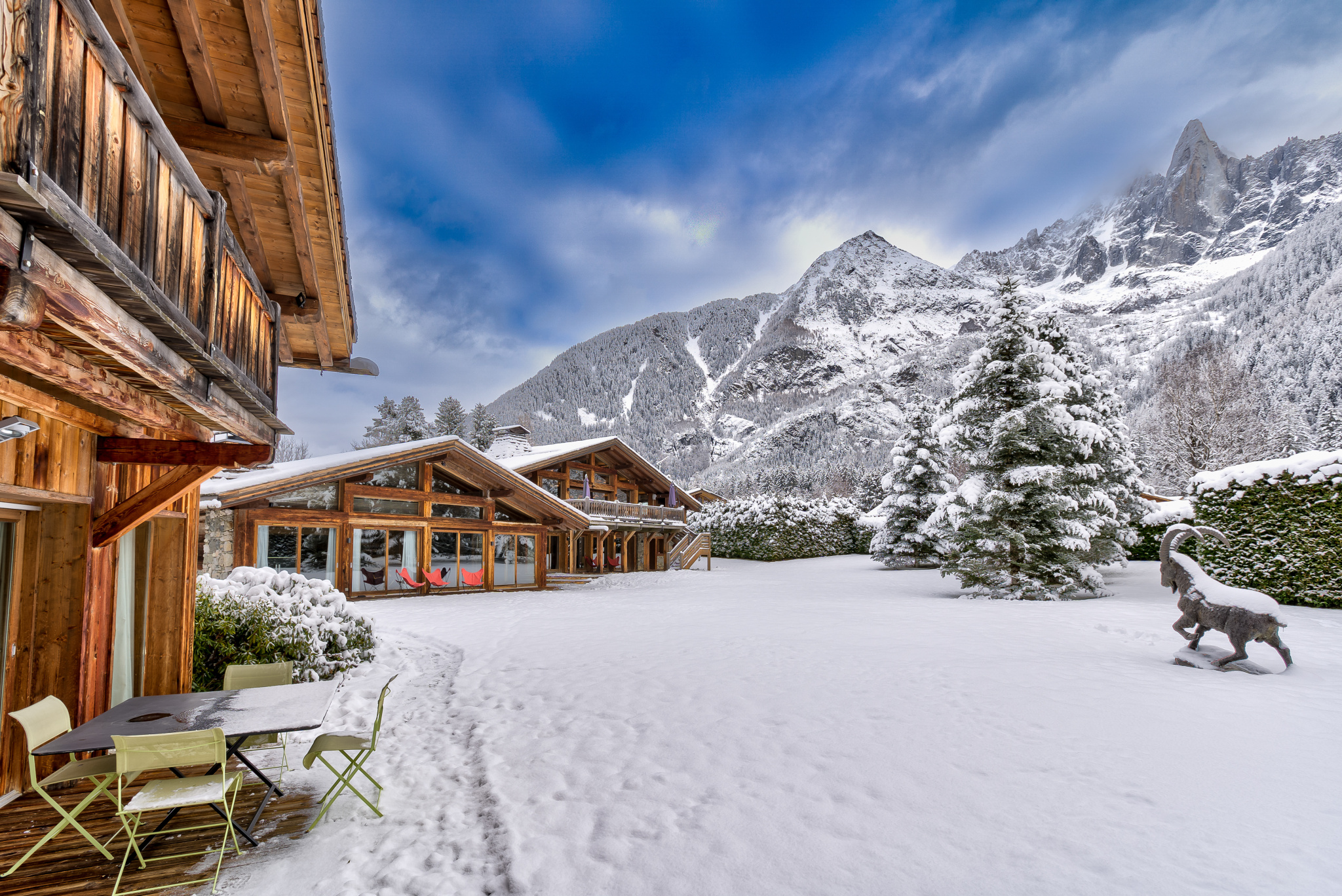 CHALET DES DRUS - Located in the heart of the popular Les Bois area near the Flegere ski lift and the Chamonix golf course, this iconic property of 590 m2 of living space, completed by a 32 m2 garage, sits on an exceptionally private plot of 3834 m2. Offering a 360o panoramic view of the surrounding mountains, this chalet benefits from a rare and privileged location. Built in 2009 with very high quality finishes, the chalet was completely renovated in 2021. The main chalet, spread over two floors, is composed as follows:First floor: an impressive living room of 126 m2 with double height 'cathedral' ceiling which opens onto a 40 m2 terrace via large bay windows, offering one of the most spectacular views of the Mont Blanc massif. A 21 m2 media area, separated by an elegant glass partition, completes this floor, in addition to two terraces.Ground floor: A spacious 45 m2 master suite with direct access to the garden and a mezzanine dressing room. A large entrance hall with a majestic staircase, three 24 m2 bedrooms, each with its own private bathroom and direct access to the garden. An office and a wellness area including a Technogym equipped gym, a hammam and a 5 x 3 meter indoor swimming pool with a counter-current swimming system. This level also includes a laundry room and a winter entrance with ski / bike area. On a separate floor, a large 41 m2 children's playroom. To the left of the winter entrance, a 'Staff' Chalet, an independent 26 m2 apartment for staff or an au pair.A guest chalet comprising two bedrooms with private bathrooms, a living area and a jacuzzi. The 30 m3 en-suite bedroom with dressing room located on the upper floor, with its large bay windows, offers the best view of the Drus, the emblematic mountain of Chamonix, from which the chalet takes its name.The 32 m2 garage, currently being finished, will accommodate two vehicles and has charging stations as well as a storage space. The chalet is equipped with a heat pump / aquathermal heating system and benefits from high-speed internet connection.This chalet is undoubtedly one of the most beautiful residences offered in Chamonix.